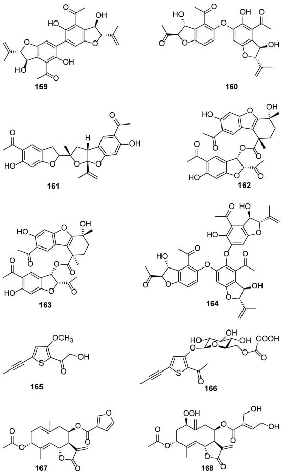 E. heterophyllum DC. is a species endemic to China and is widely distributed in the grasslands and forest areas of the Hengduan Mountains and surrounding areas, at an altitude of 1700–3000 m. In Chinese folk medicine, the stems and whole plants of this species have been used to treat various injuries and trauma [53]. However, phytochemical studies are very limited in this plant. The research on the chemical compositions of this plant species has only begun recently and the research is relatively concentrated. Therefore, this is also the first review reporting the chemical compositions of this plant (Table 4). Compounds 141–179 are isolated and characterized from the roots and leaves of E. heterophyllum (Figure 5) [53,54,55,56]. Compounds 141–166 are benzofuran and thiophene derivatives isolated from the roots of E. heterophyllum [53,54,55]. Compounds 167–179 are sesquiterpenoids and are isolated from the leaves of this plant [56]. Unfortunately, none of the aforementioned compounds have been evaluated for any activity. Therefore, in terms of chemical structures, the discovered compounds have a large polarity. In fact, excavation of the medium to lower polarity compounds of this plant may be continued and discoveries may happen.