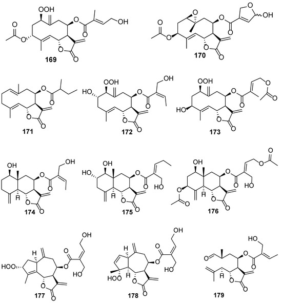 E. macrocephalum Less. is a perennial herb widely distributed in the New World, from Mexico to Argentina. It is described as an invader of grasslands, wetlands, and roadsides in several provinces of South Africa. However, it is used in Paraguayan folk medicine as an anti-inflammatory and sedative agent and for the treatment of cardiac diseases [60]. Compounds 184–186 are three undescribed germacranolide sesquiterpenoids isolated from the aerial parts of E. macrocephalum (Table 5 and Figure 6). Of them, compounds 184 and 185 displayed moderate-to-potent cytotoxicity against nine human cancer cell lines, namely human glioma cells (U251), human melanoma cells (UACC-62), MCF-7, human multiple-drug resistant breast cancer cells (NCI/ADR-RES), renal clear cell adenocarcinoma cells (786–0), non-small cell lung cancer cells (NCI–H460), human ovarian cancer cells (OVCAR-3), human colon cancer cells (HT-29), and human erythroleukemia cells (K562), with IC50 values of 0.576–6.37 μM [60].