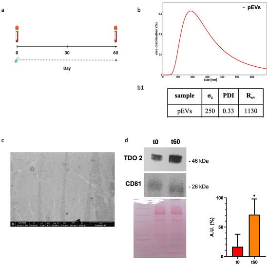 Characterization and TDO 2 content of EVs isolated from the plasma of subjects with dysbiosis. (a) Timeline of the blood draws conducted on subjects who took Acronelle® for 60 days. (b) Size and size distribution of vesicles determined by dynamic light scattering (DLS) experiments. The red curve represents the size distribution of plasmatic EVs (pEVs). (b1) Parameters of biophysical characterization of vesicles by DLS (σz: z-averaged hydrodynamic diameter; PDI: polydispersity index; Rev: Rayleigh ratio of vesicle population). (c) Electron micrography of pEVs. (d) Representative Western blot and relative histograms showing the presence and levels of TDO 2 in pEVs, which show higher levels of TDO 2 in the plasma of patients with dysbiosis after 60 days (t60) of probiotics mix assumption compared with those obtained from the same subjects (t0). The image shows CD81 as a typical EV marker and Ponceau staining as a loading control. * p < 0.05.