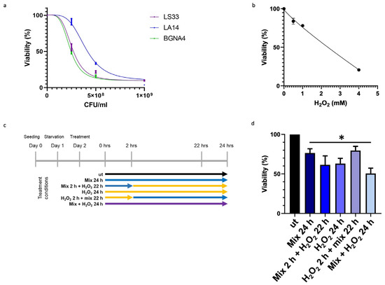 Effect of probiotics on the viability of HT29 measured by the MTT assay. (a) Effect on the viability of HT29 treated with LS33, LA14, and BGNA4. Nonlinear regression and IC50 calculations were performed using GraphPad Prism 8 software (GraphPad Software). IC50 LS33: 2.7 × 108 CFU/mL; IC50 LA14: 5.3 × 108 CFU/mL; IC50 BGNA4: 3.3 × 108 CFU/mL. Values are presented as means ± S.D. (n = 3). (b) Nonlinear regression and IC50 calculations of the effect on the viability of HT29 treated with H2O2 and IC50 calculation. IC50 H2O2: 2135 mM. Values are presented as means ± S.D. (n = 4). (c) Timeline of treatments: ut: untreated cells; mix 24 h: cells treated with a probiotics mix for 24 h; mix 2 h + H2O2 22 h: cells pretreated with a probiotics mix for 2 h and then with H2O2 for 22 h; H2O2 24 h: cells treated with H2O2 for 24 h; H2O2 2 h + mix 22 h: cells pretreated with H2O2 for 2 h and then with a probiotics mix for 22 h; mix + H2O2 24 h: cells treated simultaneously with a probiotics mix and H2O2 for 24 h. (d) Cytoprotective effect of the probiotics mix on H2O2-exposed HT29. The data represent the mean ± S.D. (n = 8). * <0.05 vs. UT.