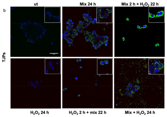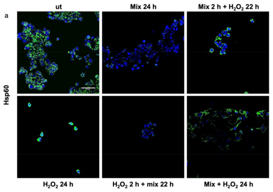 Anti-stress effect of probiotics against oxidative stress induced by H2O2 in HT29. Representative images captured for Hsp60 (green) (a) and tight junction protein (TJP) (green) (b) detection using immunofluorescence. Nuclei were counterstained with DAPI (blue). The observation using confocal microscopy confirmed that the probiotic treatment reduced stress induced by H2O2 in HT29 and restored the epithelial barrier. Scale bars = 50 μm. ut: untreated cells; mix 24 h: cells treated with a probiotics mix for 24 h; mix 2 h + H2O2 22 h: cells pretreated with a probiotics mix for 2 h and then with H2O2 for 22 h; H2O2 24 h: cells treated with H2O2 for 24 h; H2O2 2 h + mix 22 h: cells pretreated with H2O2 for 2 h and then with a probiotics mix for 22 h; mix + H2O2 24 h: cells treated simultaneously with a probiotics mix and H2O2 for 24 h.
