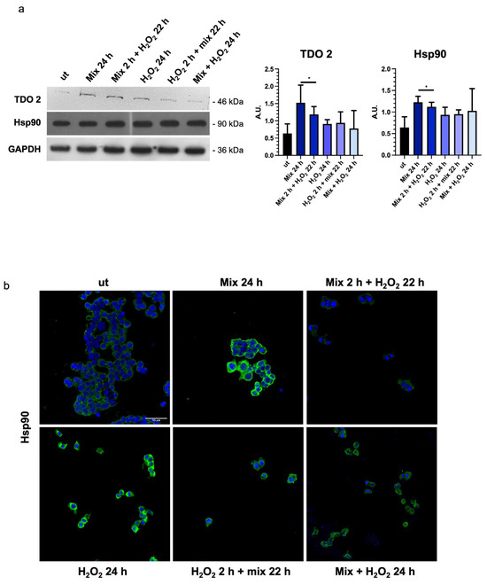 Probiotics treatment increases TDO 2 and Hsp90 protein levels. (a) Representative blots and histograms show that the probiotics mix treatment induced an increase in TDO 2 and Hsp90 protein levels in HT29 cells. GAPDH was used as an internal control. The histograms show the TDO 2/GAPDH and Hsp90/GAPDH levels (mean ± SD) expressed as arbitrary units (AUs). The results are representative of three independent experiments (* p < 0.0001, compared to ut). (b) Representative images of immunofluorescence detecting Hsp90 (green), confirming the data obtained by the Western blot analysis. Nuclei were counterstained with DAPI (blue). Scale bar = 50 μm. ut: untreated cells; mix 24 h: cells treated with a probiotics mix for 24 h; mix 2 h + H2O2 22 h: cells pretreated with a probiotics mix for 2 h and then with H2O2 for 22 h; H2O2 24 h: cells treated with H2O2 for 24 h; H2O2 2 h + mix 22 h: cells pretreated with H2O2 for 2 h and then with a probiotics mix for 22 h; mix + H2O2 24 h: cells treated simultaneously with a probiotics mix and H2O2 for 24 h.