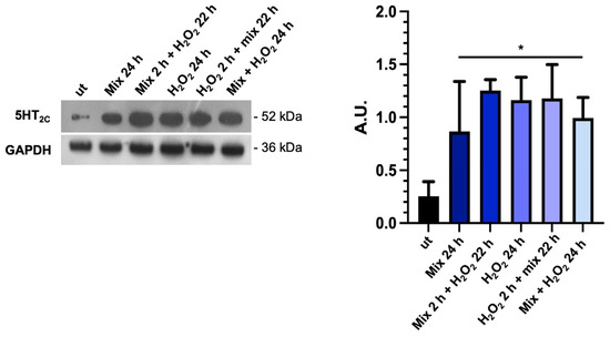 The probiotics mix modulates the expression of serotonin receptors. Western blot images of 5-HT2C protein levels and relative histograms of HT-29 cells treated with the probiotics mix and H2O2. GAPDH was used as an internal control, and results are representative of three independent experiments * p < 0.05. ut: untreated cells; mix 24 h: cells treated with the probiotics mix for 24 h; mix 2 h + H2O2 22 h: cells pretreated with a probiotics mix for 2 h and then with H2O2 for 22 h; H2O2 24 h: cells treated with H2O2 for 24 h; H2O2 2 h + mix 22 h: cells pretreated with H2O2 for 2 h and then with a probiotics mix for 22 h; mix + H2O2 24 h: cells treated simultaneously with a probiotics mix and H2O2 for 24 h.