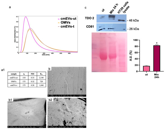 Characterization and TDO 2 content of EVs isolated from conditioned medium of HT29. (a) Size and size distribution of vesicles determined by dynamic light scattering (DLS) experiments. The red curve represents the size distribution of plasmatic EVs (pEVs); the pink curve shows conditioned medium EVs (cmEVs-ut) of untreated HT29; the ocher curve shows outer membrane vesicles (OMVs); the gray curve shows conditioned medium EVs of HT29 treated with the probiotics mix of cmEV-treated cells (cmEVs-t). (a1) Parameters of the biophysical characterization of vesicles by DLS (σz: z-averaged hydrodynamic diameter; PDI: polydispersity index; Rev: Rayleigh ratio of vesicle population). (b,b1,b2) Electron micrography of cmEVs-ut, cmEVs-t, and OMVs, respectively. (c) Representative Western blot and relative histograms showing the presence and levels of TDO 2 in HT29-derived EVs. The higher levels of TDO 2 in EVs isolated from cell medium after treatment with the probiotics mix compared with those obtained from untreated cells are visible. The image shows CD81 as a typical EV marker and Ponceau staining as a loading control. * p < 0.05. ut: untreated cells; mix 24 h: cells treated with the probiotics mix for 24 h.