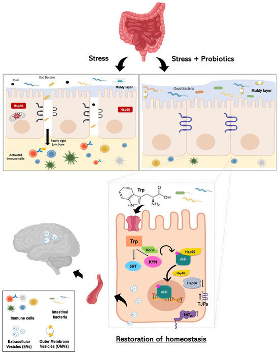 Working hypothesis. Summarizing our working hypothesis, we assume that treatment with the probiotics mix induces an increase in the metabolism of the aminoacidic tryptophan as a precursor for the synthesis of kynurenine. The latter is a product metabolized by the enzyme TDO2. Kynurenine binds AhR, which acts as a ligand-dependent transcription factor capable of controlling complex transcriptional processes. AhR is a cytoplasmic transcription factor that is normally found in an inactive form bound to the co-chaperone Hsp90 and can be activated by various indole derivatives, including kynurenine. Upon binding, the Hsp90 chaperone dissociates and AhR heads into the cell nucleus, acting in favor of the host homeostasis. The probiotics mix acts on cell stress, inducing a reduction of Hsp60 level in H2O2-exposed cells, and has a positive effect on intestinal permeability, increasing the expression of junctional proteins. Furthermore, following the complex two-way communication system that characterizes the gut–microbiota–brain axis, the increased tryptophan metabolism at the intestinal level induced by probiotic intake could lead not only to increased synthesis of kynurenine but also to increased concentration of serotonin by increasing the levels of 5-HT2C and the systemic levels. This can result in a mechanism that can be able to limit stress-related psychiatric disorders. Finally, since plasma-derived EVs and vesicles isolated from HT-29 cells showed an increase in TDO 2 protein levels following probiotic treatment; our data suggest that EVs may extend the regulation of host homeostasis by inducing protection even at the level of the central nervous system against neurodegenerative and neuropsychiatric disorders, including depression.