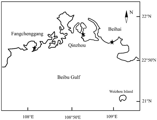 The “South China No. 1” breed was bred through backcross of (Crassostrea hongkongensis ♀ × C. gigas ♂) ♂ and C. hongkongensis ♀. The “South China No. 1” breed and the control group of C. hongkongensis were fertilized at the same time and bred in the Zhanjiang Marine Economic Animal Experiment Station of the South China Sea Institute of Oceanography. After a period of time, they were collected at the same time and transferred to the experimental site. The experimental sites were located in three sea areas along the coast of the Beibu Gulf in China, namely Beihai (21°55′N, 109°46′ E), Qinzhou (21°40′ N, 108°42′ E) and Fangchenggang (21°31′ N, 108°14′ E) (Figure 1). The temperature, salinity and pH were 18–28 °C, 16–18 ppt and 7.6–8.4, respectively. Experiments were conducted from January 2018 to January 2019.