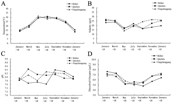 The variations in (A) temperature, (B) salinity, (C) pH and (D) dissolved oxygen at the Beihai, Qinzhou and Fangchenggang sites from January 2018 to January 2019.