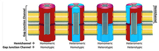 Oligomeric states of gap junction channels and hemichannels assembled from two isoforms (red and blue). HCs can exist as homomeric or heteromeric hexamers, whereas GJCs can exist as homotypic or heterotypic dodecamers. (Adapted from [9]).