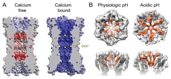 Gating mechanisms of gap junction channels during tissue injury, accompanied by Ca2+ overload and acidic pH. (A) Binding of 12 Ca2+ ions results in a channel pore that is highly electropositive, resulting in the electrostatic block of cation permeation such as K+ [13]. Electrostatic potential surfaces with positive and negative electrostatic potentials are shown in blue and red, respectively (color scale is −15 to +15 kTe−1). The protein interior is grey. Yellow spheres indicate that Ca2+ ions bind between adjacent subunits in each hemichannel. Hemispheric binding at the TMD/ECD interface directly exposes the Ca2+ ions to the aqueous pore, thereby maximizing their electrostatic positivity. (B) Similarly, acidic pH results in steric block of the channel pore by a “ball-and-chain” mechanism, in which the ball is composed of the NT domains. (Adapted from [13,14]).