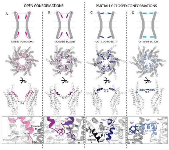 Distinct conformations of the NT domains resolved in the cryoEM structures of Cx channels. Upper panels—schematic representation of open (A,B) and partially closed (C,D) NT conformations. Central panels—a pair of top and side cutaway views for four corresponding Cx structures with differing NT conformations ((A) Cx46/50 (PDB ID:7JKC), (B) Cx26 (PDB ID:2ZW3), (C) Cx31.3 (PDB ID:6L3T), (D) Cx43 (PDB ID:7XQI)); NTs shown in color, M1–M4 and E1–E2 shown in grey; narrowest pore diameter indicated. Bottom panels—selected details of NT interactions. References: Cx26 [30], Cx31.3 [36], Cx36 [38], Cx43 [39] and Cx46 [41].