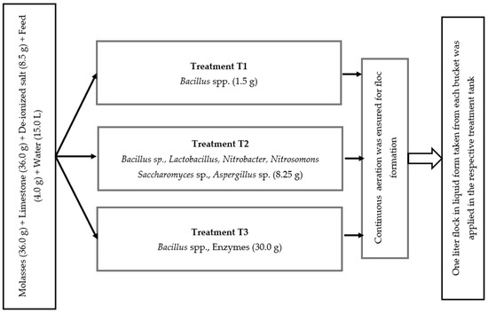Before stocking fish, the floc was prepared applying the selected three commercial probiotics (Table 1), according to the method described by [19]. The recommended amount of probiotics was separately placed into three distinct plastic buckets and meticulously mixed with water to mitigate the risk of cross-contamination. To maintain C:N ratio of 15:1, 36.0 g of molasses, 36.0 g of limestone, 8.5 g of deionized salt, and 4.0 g of feed were added into each bucket containing 15.0 L water (Figure 1). To induce flock formation in the tank, continuous aeration was ensured to diffuse the air into the water via porous air stones. Every 15 days, one liter of liquid probiotics from each bucket was incorporated into the corresponding treatment tanks. The floc volume was measured fortnightly using Imhoff cones following the process recommended by [44]. The required amount of molasses was added daily to adjust the C:N ratio.