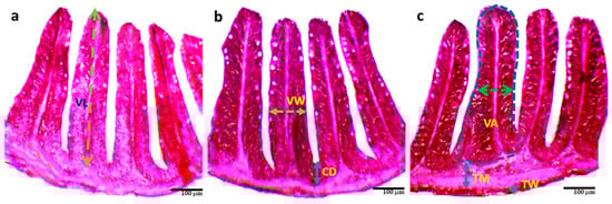 Histological changes (a–c) of the intestine of O. niloticus reared with different combinations of commercial probiotics, and enzymes in a biofloc system for 90 days; (a) = T1; (b) = T2; (c) = T3; TM = Thickness of muscular; TW = Thickness of wall; VW = Villus width; VL = Villus length; VA = Villus area; CD = Crypt depth.