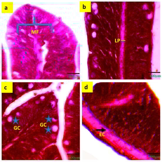 Digestive and immune response indicators (a–d) of histological gut of tilapia reared with a biofloc system for 90 days. (a) = MF (mucosal folds); (b) = LP (lamina propria); (c) = GC (goblet cell); (d) = EC (enterocyte). Arrows and grey stars indicate the specific locations of different intestinal parameters.