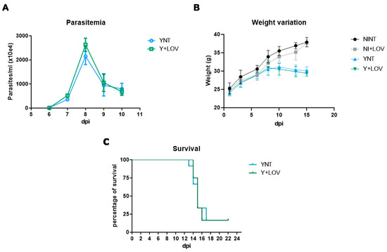 Analysis of the mice’s body weight (Figure 1B) showed no difference in this parameter. At 15 dpi, the NINT control group presented a body weight of 37.89 ± 1.28 g, the NI + LOV group 37.65 ± 0.97, the YNT group 30.10 ± 1.08 g, and the Y + LOV group 29.40 ± 0.82 g.