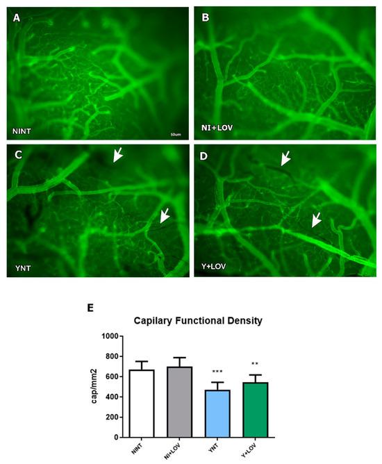 Analysis of brain capillary perfusion using intravital microscopy at 15 dpi. In YNT group (C), a decreased number of capillaries were verified, in comparison with NINT group (A). Lovastatin had no effect on this parameter in infected (D) and non-infected (B) animals. Graphic indicates the number of perfused capillaries observed (E). Arrows indicate non-perfused NI (non-infected mice); Y, infected; NT, non-treated; LOV, treated with lovastatin (20 mg/kg/day); dpi: days post infection. Asterisk compared to NINT; ** p < 0.01, *** p < 0.001. n = 4 animals per experiment in 3 independent experiments.