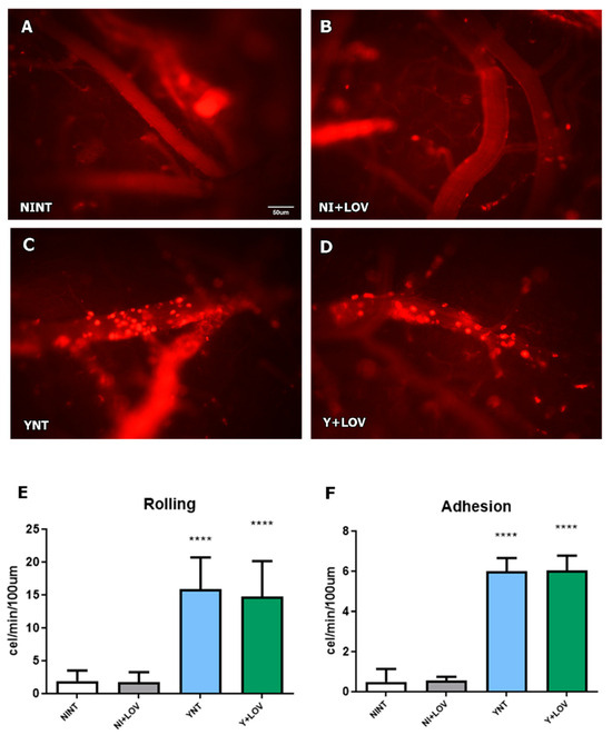 Analysis of leukocyte–endothelium interactions was performed using rhodamine-labeled leukocytes using intravital microscopy. The YNT group presented an increased number of leukocytes rolling at 15 dpi (15.87 ± 4.81 cells/min), considering the NINT control group (1.93 ± 1.57 cells/min, p < 0.001). The same pattern of YNT was observed in the Y + LOV group (14.71 ± 5.41 cells/min). When counting adherent leukocytes, both YNT and Y + LOV groups (5.99 ± 2.27 and 6.03 ± 2.54 cells/min, respectively) (Figure 3C,D) had higher numbers than the NINT control group (0.53 ± 0.65 cells/min—p < 0.001) at 15 dpi (Figure 3A). These results indicate that therapy with lovastatin did not prevent leukocyte–endothelial interactions. The NI + LOV group presented no variation in comparison to NINT (Figure 3B).