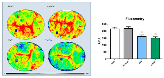Flowmetry to evaluate cerebral blood flow of infected mice at 15 dpi. A decrease in cerebral blood flow was observed in the YNT group in comparison to NINT group. Treatment with lovastatin had no effect on this in Y + LOV and NI + LOV animals. Graphic shows cerebral blood flow analysis through arbitrary perfusion units (APUs). The numbers 1 and 2 correspond to the area from the craniotomy, which was used for this analysis. NI, non-infected; Y, infected; NT, non-treated; LOV, treated with lovastatin (20 mg/kg/day); dpi, days post infection. Asterisk compared to NINT; ** p < 0.01, *** p < 0.001 n = 3/4 animals per experiment in 3 independent experiments.