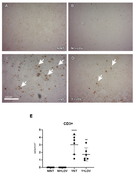 Evaluation of the presence of CD3+ cells in mice’s brain using immunohistochemistry at 15 dpi. (A–D) Representative images of CD3+ staining for each group. CD3+ cells were not found in NINT group (A). YNT group (C) presented a higher number of CD3+ cells in comparison to NINT. Treatment with lovastatin in infected (D) and non-infected (B) animals presented no difference when compared with the respective non-treated group. Graphic indicates the amount of CD3+ cells per mm2 (E). Arrows show positive cells. NINT, non-infected non-treated; NI + LOV, non-infected treated with lovastatin (20 mg/kg/day); YNT, infected non-treated; Y + LOV, infected treated with lovastatin (20 mg/kg/day); dpi, days post infection. Asterisk compared to NINT; ** p < 0.01, **** p < 0.0001. n = 3 animals per experiment in 2 independent experiments.