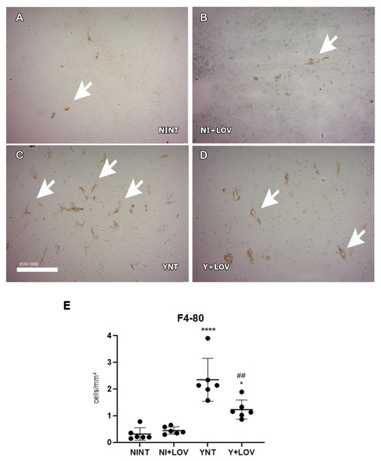 Evaluation of the presence of F4/80+ cells in mice’s brain using immunohistochemistry at 15 dpi. (A–D) Representative images of F4/80+ staining for each group. A low number of F4/80+ cells were found in NINT group (A). YNT group (C) had an increase in the number of F4/80+ cells in comparison to NINT. Lovastatin treatment was able to prevent this increase in infected animals (D). Treatment had no effect on non-infected animals (B). Graphic indicates the number of F4/80+ cells per mm2 (E). Arrows indicate positive cells. NINT, non-infected non-treated; NI + LOV, non-infected treated with lovastatin (20 mg/kg/day); YNT, infected non-treated; Y + LOV, infected treated with lovastatin (20 mg/kg/day); dpi, days post infection. Asterisk compared to NINT; Sharp compared to YNT; * p < 0.05, ## p < 0.01, **** p < 0.0001. n = 3 animals per experiment in 2 independent experiments.