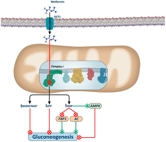 The precise mechanism by which metformin targets Complex I and exerts its function remains under investigation. In 2014, Bridges et al. [40] demonstrated that metformin interacts with the Cys39-containing matrix loop of the respiratory chain subunit ND3. They observed that metformin binds to Complex I in a deactive-like open-loop conformation, stabilizing the enzyme in an inactive state. Consequently, this inhibition leads to a lower proton gradient and reduced adenosine triphosphate (ATP) synthesis due to diminished nicotinamide adenine dinucleotide (NADH) oxidation, proton pumping across the inner mitochondrial membrane, and oxygen consumption rates. In 2023, the same group identified up to three potential binding sites for biguanides within various protein subunits of Complex I [41]. The primary inhibitory site is situated within the amphipathic region of the quinone binding channel (Q-channel), adjacent to a mobile structural element within the NDUFS7 subunit [18]. Mechanistically, these studies revealed that synthetic biguanide binding at this site prevents Complex I reactivation. Consequently, this inhibition leads to a moderate reduction in ATP synthesis in the liver, as NADH cannot transfer its electrons to Complex I. This limitation thereby reduces mitochondrial respiratory chain activity, leading to a decrease in the ATP-dependent gluconeogenic process (Figure 1).