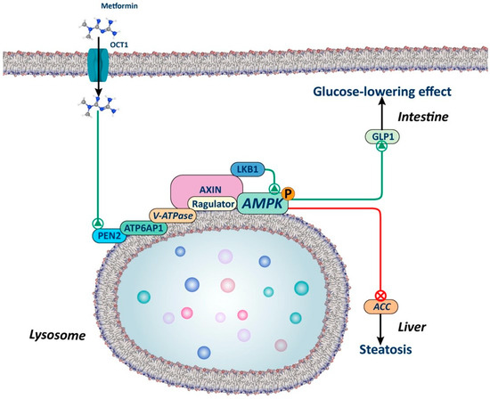 Low doses of metformin have been reported to activate AMPK through an AMP-independent mechanism involving the lysosomal protein complex v-ATPase-Ragulator in hepatocytes (Figure 2). This complex was described as an endosomal docking site for AXIN 1/LKB1 to mediate AMPK activation [52,53]. This mechanism relies on the interaction of presenilin enhancer 2 (PEN2) with the biguanide moiety of metformin; PEN2 is then recruited to the accessory protein v-ATPase ATP6P1 and v-ATPase is inhibited. As a result of v-ATPase inhibition, AXIN-LKB1 translocation to the lysosome surface is promoted, which leads to AMPK activation in the lysosome [54]. This novel mechanism may be particularly relevant in the intestine and liver, since the deletion of PEN2 abolishes the beneficial effects of glucagon-like peptide 1 (GLP1) secretion in mice enterocytes and blunts the reduction in hepatic lipid content in mice fed a high-fat diet [54].