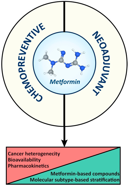 Despite these nuanced findings, a consistent association between metformin exposure and reduced risk of hormone receptor-positive (HR+)/human epidermal growth factor receptor 2-negative (HER2) breast cancer is evident [123]. Another study exposes the significant limitations of real-world observational studies in accurately assessing metformin’s effects on cancer incidence and outcomes due to avoidable biases that, surprisingly, persist today [127]. These controversial studies underscore the importance of stratifying patients by molecular subtype to gain a clearer understanding of the effects of metformin within more homogeneous cohorts. Moreover, these conflicting results are similarly observed in studies investigating the potential of metformin as a chemopreventive or adjuvant agent [127,128].