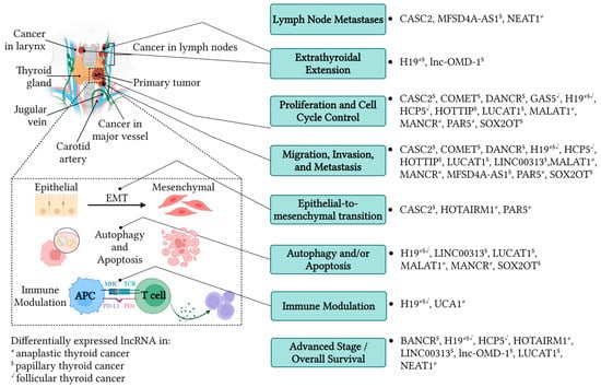 The need for biomarker identification in ATC lies at various levels of intervention; molecules that describe its unique, fast-growing nature, its resistance to conventional and innovative therapeutics, and its grim patient survival outcomes will enable a greater understanding of why ATC is so difficult to characterize. Due to the therapeutic refractive nature of ATC, identification of molecules that can serve as prognostic or diagnostic biomarkers is a critical need aimed at improving patient outcomes []. Analysis of differentially expressed lncRNAs in ATC tissue have contributed to the annotation of both the genomic integrity and cellular functions of this aggressive cancer type. The following lncRNAs discussed in this review have been functionally annotated in ATC and have contributed to the understanding, in part, of how its carcinogenic programs are established. Both the in vitro and in vivo experimental designs of lncRNA assessment in the following studies were evaluated according to the genomic profiling of patient tissues. Assessment of functional consequences of the over- or under-expression of candidate lncRNA molecules in vitro and in vivo was accomplished using gene-editing technologies (Table 1).