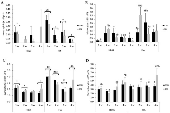 Peripheral neutrophils in FIA-injected fish were highest at 1 week, compared to the other sampling times, at which point neutrophil concentration was also higher than that measured in the HBSS group (Figure 1A). Neutrophil concentration was also highest at 1 week within each dietary treatment, CTRL and TRP. Also, a significant increase in FIA-injected fish, as opposed to the HBSS group, was only observed in the CTRL group and not in TRP. An increase followed by a subsequent drop in peripheral monocyte numbers was observed in FIA-injected fish in both dietary treatments (Figure 1B); yet, while the highest concentration in the CTRL group was observed at 3 weeks, in fish fed the TRP diet, it was detected at 2 weeks. At both peaking points, FIA-injected fish showed significantly higher monocyte numbers than their HBSS counterparts. No effects of dietary treatments were observed on lymphocyte numbers (Figure 1C). FIA-injected fish sampled at 1 and 2 weeks presented higher lymphocyte concentrations than those injected with HBSS. Additionally, peripheral lymphocyte counts of fish undergoing inflammation were lowest at 3 weeks, and despite it increasing at 4 weeks, levels were still lower than those of fish sampled at 1 week. Thrombocyte concentration at 4 weeks in TRP, FIA-injected group was the highest amongst all comparable groups (Figure 1D).
