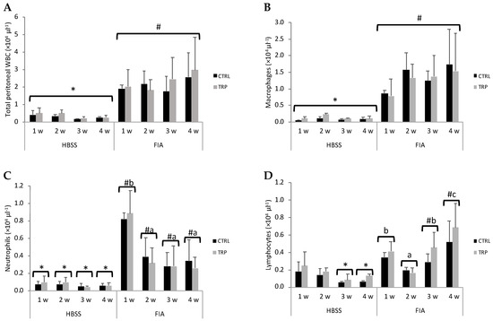 Total WBC (A), macrophages (B), neutrophils (C) and lymphocyte concentrations (D) in the peritoneal cavity of European seabass at 1, 2, 3 and 4 weeks following intraperitoneal injection with HBSS or FIA (means ± SD, n = 9). Lowercase letters indicate significant differences attributed to sampling time (a < b); different symbols stand for significant differences between stimuli (* < #); (multifactorial ANOVA followed by Tukey post hoc test to identify significantly different groups; p ≤ 0.05).