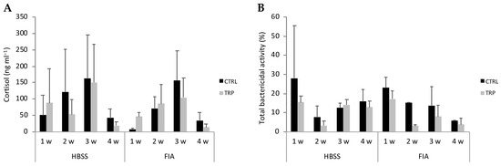 The full set of results is presented in Table S4 of the Supplementary File. Plasma cortisol levels and peroxidase activity were modulated by sampling time, regardless of dietary treatment or stimulation (Figure 3A). Cortisol peaked at 3 weeks and then dropped to levels similar to those observed at 1 week. Differently, peroxidase activity in fish sampled at 4 weeks was lower than in those sampled at 1 week. Lysozyme concentration in FIA-injected fish increased over time and was higher than HBSS-injected fish at 4 weeks. Total bactericidal activity decreased from 1 to 2 weeks and remained low until the last sampling point, regardless of dietary treatment and stimulation (Figure 3B). Additionally, the TRP group’s bactericidal activity was lower than that of the CTRL group, irrespective of sampling time or stimulation.
