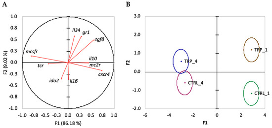 When evaluating linear functions of variables (immune-related transcripts in the head kidney) and their contributions to differences between dietary groups undergoing an inflammatory response for one and for four weeks (CTRL_1, CTRL_4, TRP_1 and TRP_4), the overall discriminant analysis performance was very reasonable (Wilks λ = 0.033, p < 0.0001). It resulted in three discriminant functions, with the first two accounting for 95.2% of the total variability (Figure 6A). The first discriminant function (F1, 86.2%) was negatively loaded by mcsfr (i.e., lower gene expression) and positively loaded by cxcr4 and tgfβ (i.e., higher gene expression; Figure 6A, correlations of −0.81, 0.73 and 0.56, respectively), whereas the second function (F2, 9%) was positively loaded by il34 and gr1 (Figure 6A, correlations of 0.58 and 0.57, respectively). The analysis of Mahalanobis distances between groups’ multivariate means demonstrated that CTRL_1 is significantly different from CTRL_4, and TRP_1 is significantly different from TRP_4 (p < 0.0001, Figure 6B).