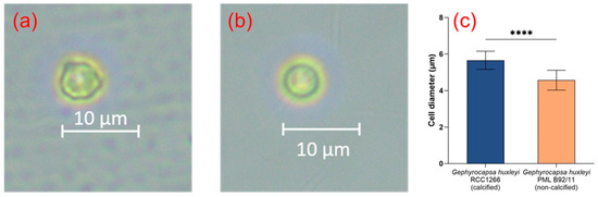 The microscopic image of G. huxleyi RCC1266 showed that the cells were calcified with extracellular coccoliths, with significantly larger cell size compared to G. huxleyi PML B92/11 (Figure 1a–c). The average cell diameters of G. huxleyi RCC1266 and G. huxleyi PML B92/11 were 5.66 ± 0.50 μm and 4.57 ± 0.54 μm, respectively.