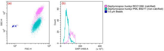 Flow cytometry plot (a) showing different features between Gephyrocapsa huxleyi calcified RCC1266 (pink) and Gephyrocapsa huxleyi non-calcified PML B92/11 (green) identified by γem ~690 nm compared to the 1 μm bead standards (blue) identified by γem ~525 nm based on forward scatter and side scatter. Flow cytometry plot (b) in γem ~450 nm showing different DNA contents between Gephyrocapsa huxleyi calcified RCC1266 (pink) and non-calcified PML B92/11 (green).