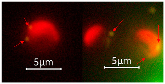 Selected fluorescent microscopic images showing phagocytosis evidence of Gephyrocapsa huxleyi under light. Arrows indicate the position of ingested prey surrogates, and only 0.5 μm beads were shown as they achieved the best aesthetic result with suitable fluorescence intensity.