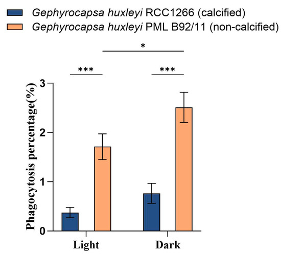 The flow cytometry examination showed significantly different phagocytosis percentages between G. huxleyi RCC1266 and G. huxleyi PML B92/11 under both light and dark conditions (Figure 4). The non-calcified strain G. huxleyi PML B92/11 exhibited much higher phagocytosis rates than those of the calcified strain, with about 4.6- and 3.3-times values of those in the calcified strain in light and dark conditions, respectively. In addition, for the non-calcified strain PML B92/11, a significantly higher phagocytosis percentage was observed under dark condition (2.51% ± 0.31%) than under light (1.71% ± 0.26%). On the contrary, there was no significant difference in the phagocytosis percentage between light and dark conditions for the calcified strain (Figure 4, Figures S1 and S2).