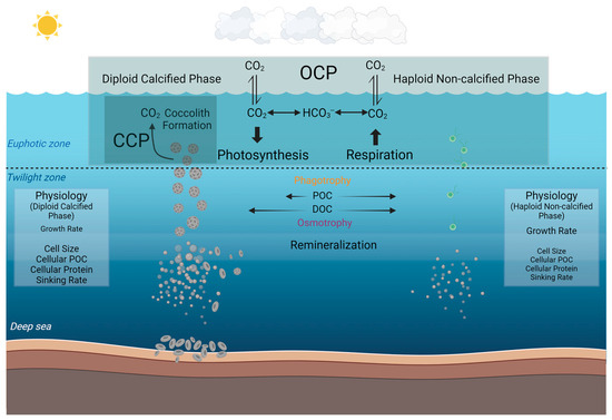 Conceptual model illustrating the different roles that calcified and non-calcified phases of Gephyrocapsa huxleyi may play in the marine carbon cycle by synthesizing the results of the present study and previous results. The organic carbon pump (OCP) denotes the organic carbon production through photosynthesis, and the carbonate counter pump (CCP) denotes the calcification process of calcium carbonate (coccoliths) production [77,78]. In our investigation, the particle organic carbon can be phagocytosed to a higher percentage in the non-calcified phase than the calcified phase in the dark as compared to the light condition. Dissolved organic carbon (DOC) has been reported to be utilized by coccolithophores with osmotrophy in low light [39,65]. The physiological differences in terms of growth rate, cell diameter, cellular POC, cellular protein, and sinking rate are also listed (The relative font size indicates the relative magnitude of each physiological metric between the two phases) [32]. This figure was created at BioRender.com (accessed on 2 April 2024).