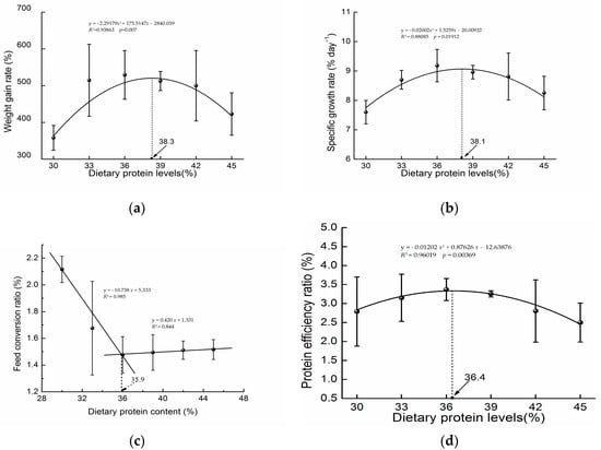 Analysis of optimal dietary protein levels for growth and feed efficiency in hybrid sturgeon through models. (a) Quadratic curve analysis of the relationship between dietary protein levels and weight gain rate; (b) quadratic curve analysis of the relationship between dietary protein levels and specific growth rate; (c) broken-line analysis of the relationship between dietary protein levels and feed conversion ratio; (d) quadratic curve analysis of the relationship between dietary protein levels and protein efficiency ratio. The data are reported as means ± error (n = 3).