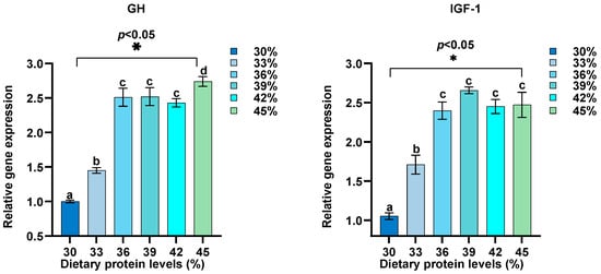 Effects of different protein levels on GH and IGF-1 expression in the intestine of hybrid sturgeon (n = 3). β-actin was used as the housekeeping gene to normalize the data. Letters indicate significant differences.