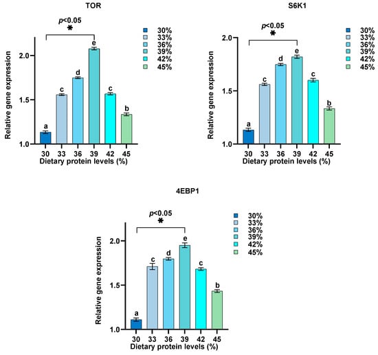 Impact of varied protein levels on the expression of TOR, S6K1, and 4EBP1 in the intestine of hybrid sturgeon (n = 3). β-actin was used as the housekeeping gene to normalize the data. Letters indicate significant differences.