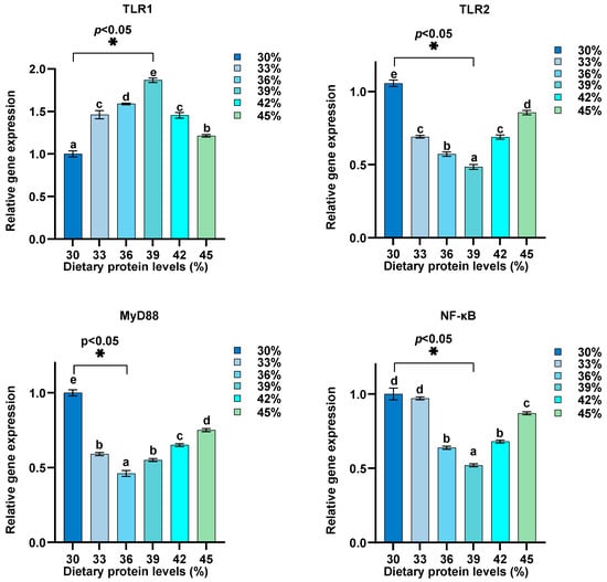 Influence of dietary protein levels on innate immunity gene expression in the intestine of hybrid sturgeon (n = 3). β-actin was used as the housekeeping gene to normalize the data. Letters indicate significant differences.