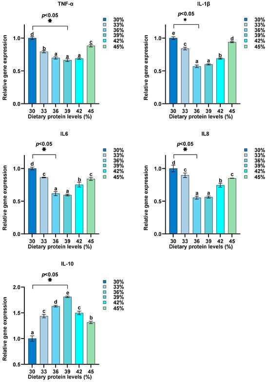 Effects of dietary protein levels on inflammatory response gene expression in the intestine of hybrid sturgeon (n = 3). β-actin was used as the housekeeping gene to normalize the data. Letters indicate significant differences.