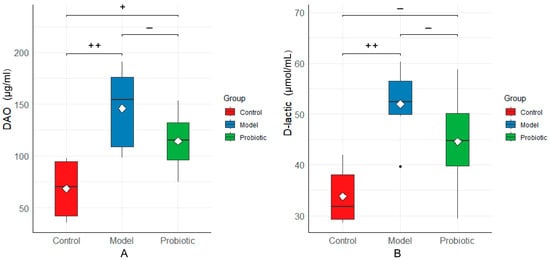 3.2.2. The Probiotics Reduced the DAO and D-Lactic Acid Levels (Indicators of Intestinal Barrier Permeability of Rabbits)