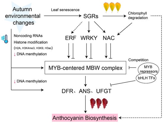 Histone modifications are also evidently important in regulating anthocyanin biosynthesis. In Arabidopsis, the deposition of H2A.Z, a histone H2 variant, downregulates the expression of several genes related anthocyanin biosynthesis by inhibiting trimethylation of lysine 4 on histone H3 (H3K4me3), thereby preventing anthocyanin accumulation between the hypocotyl and cotyledons [50]. In poplar, a conserved histone H3K9 demethylase, JMJ25, directly binds to the negative transcription factor PtrMYB182 gene loci and upregulates its expression, thereby inhibiting anthocyanin biosynthesis in leaves [51]. Histone acetylation can also affect the production of anthocyanin. In pear fruit, the PpERF9-PpTPL1 complex decreased the level of Histone H3 acetylation (H3ac) in the promoter regions of PpRAP2.4 and PpMYB114, which inhibited the expression of these genes, and ultimately suppressed anthocyanin biosynthesis [52]. As DNA methylation and histone modifications have a dose effect, further study could be conducted to reveal the gradual changes in gene expression in response to leaf senescence.