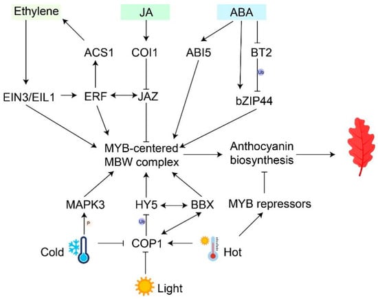 Light exposure has been proven to increase anthocyanin biosynthesis in plants (Figure 2) [23]. Without light, aging leaves could not accumulate anthocyanin [85]. Specifically, the quality, duration, and intensity of light have a significant impact on the accumulation of anthocyanins [17]. For instance, apple fruits directly exposed to light showed a more intense anthocyanin pigmentation compared to the wrapped ones [25]. In addition, light quality also affects anthocyanin biosynthesis [86,87]. UV-A irradiation and high red light have been reported to induce anthocyanin content in tomato seedlings compared to darkness [88,89]. Recently, the mechanism of light-controlled anthocyanin biosynthesis has been widely reported. CONSTITUTIVE PHOTOMORPHOGENIC1 (COP1) is a key suppressor in light signal transduction downstream of the photoreceptor. In darkness, MdCOP1 protein interacts with MdMYB1 and mediates its ubiquitination and degradation, thereby inhibiting apple fruit coloration [90]. Several transcription factors (e.g., HY5 and BBX) are involved in the light signal regulation of anthocyanin biosynthesis [39,91]. HY5 can not only directly activate structural genes but also regulate MYB transcription factors and the MBW complex to indirectly affect the expression of structural genes [92,93]. In purple pummelo (Citrus grandis), CgHY5 is induced by light and directly binds to the G-box within an R2R3 MYB transcription factor (CgRuby1) promoter, leading to anthocyanin accumulation [94]. Recently, it has been reported that protein complexes regulate downstream gene expression by activating anthocyanin biosynthesis [95]. In poplars, PtrHY5 interacts with the PtrBBX23 gene through the C-terminal bZIP domain to enhance the expression of downstream genes and modulate the accumulation of anthocyanins in the leaf [96]. Some studies have shown that protein phosphorylation is a part of the light-induced developmental processes. Protein phosphorylation induced by mitogen-activated protein kinase (MAPK) contributes to anthocyanin accumulation [97]. Light-induced MPK4 phosphorylation of MYBs promotes its stability and increases anthocyanin accumulation in Arabidopsis and apples [98,99].