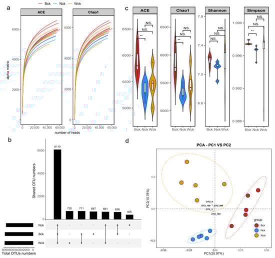 Illumina sequencing results and carbon sequestration microbial community diversity: (a) sample dilution curve; (b) OTU distribution map; (c) cbbM microbial alpha diversity index; (d) cbbM microbial principal component analysis. NS indicates p > 0.05, and ** indicates p < 0.01.