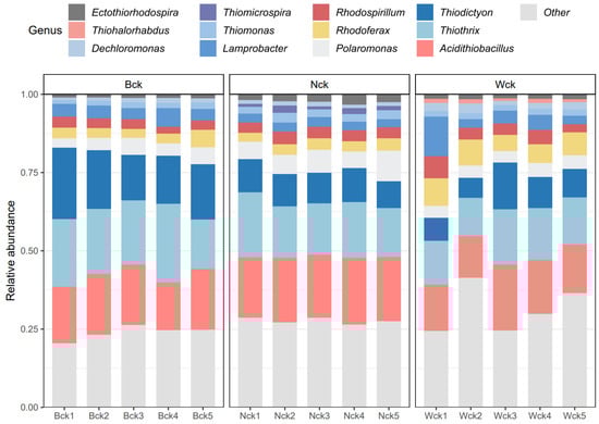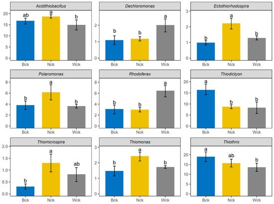 At the phylum level, proteobacteria emerged as the dominant bacterial group in the wetland soil of Qinghai Lake, constituting a relative abundance exceeding 99.9%. Unclassified genera accounted for 23.09% to 30.32% of bacterial relative abundance. Twelve genera-level bacteria with relative abundances greater than 1% in the Qinghai Lake wetland were selected to construct a histogram of relative abundance percentages (Figure 2). Thiothrix, Acidithiobacillus and Thiodictyon were the most abundant, all belonging to Proteobacteria, with average relative abundances of 17.18%, 17.75% and 12.01%, respectively. ANOVA analysis revealed that nine genera-level microflora (relative abundance > 1%) were significantly influenced by wetland type (Figure 3). Distinct biomarkers were identified for different wetland types. Acidithiobacillus, Ectothiorhodospira, Polaromonas, Thiomicrospira and Thiomonas exhibited the highest relative abundances in lakeside wetlands. Dechloromonas and Rhodoferax were most abundant in river source wetlands, while Thiodictyon and Thiothrix dominated in swamp wetlands.