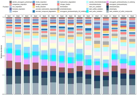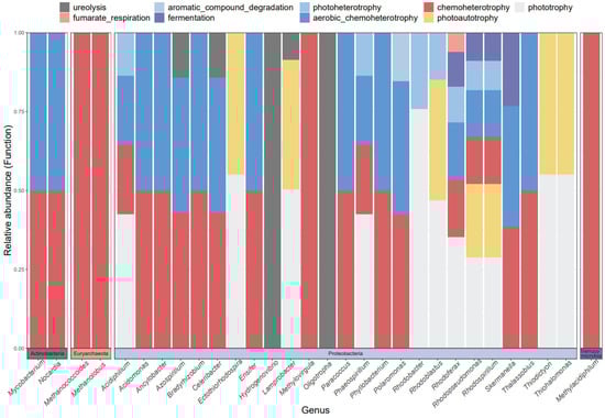 The FAPROTAX function annotation results of the carbon sequestration microbial community in Qinghai Lake wetlands (Figure 4) revealed that the ecological functions of the community could be categorized into 25 functional groups (with relative abundances exceeding 1%). Among the microbial functions associated with cbbM (Top 10), the predominant ones included dark_oxidation_of_odor_compounds (12.49%), phototrophy (8.71%), anoxygenic_photoautotrophy (7.13%), photoautotrophy (7.13%), anoxygen_photoautotrophy_S_oxidizing (7.13%), dark_oxidation (6.72%), dark_sulfide_oxidation (6.33%), dark_iron_oxidation (5.96%), chemoheterotrophy (4.53%), and aerobic_chemoheterotrophy (4.52%). The relative abundance of each was closely related to wetland type. The corresponding microflora were reversed through the nine main functional groups of the C cycle (Figure 5), and it was found that cbbM carbon sequestration microorganisms in the Qinghai Lake wetland were in 30 genus-level microflora of four phyla, of which 25 genus-level microflora belonged to Proteobacteria. The predominant functional groups among most bacteria were phototrophs and photoautotrophs, while some bacteria also exhibited chemoheterotrophs and aerobic chemoheterotrophs as primary functional groups.