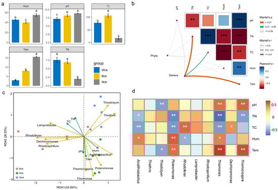 Correlation between soil environmental factors and carbon-sequestering microorganisms in the Qinghai Lake wetlands: (a) changes in physicochemical factors in different types of wetlands; (b) correlation network diagram between carbon-sequestering microbial community characteristics and environmental factors; (c) redundancy analysis of environmental factors and genus-level microflora (Top 10); (d) heatmap of correlation between environmental factors and genus-level microflora (Top 10). abc indicates significance, the same letter indicates no significant difference between groups (p > 0.05), and different letters indicate a significant difference between groups (p < 0.05); * indicates p < 0.05, ** indicates p < 0.01, *** indicates p < 0.001.