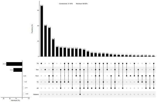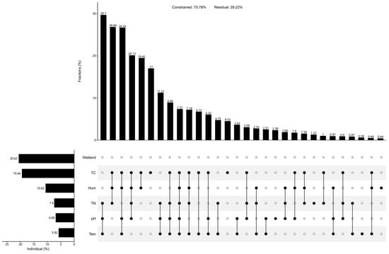 The physical and chemical factors of the soil were significantly influenced by wetland types, displaying notable spatial variations (p < 0.05) (Figure 6a). Regarding physical factors, lakeside wetlands exhibited significantly higher temperatures and humidity levels compared to marsh and riverhead wetlands. Although the soil moisture of the riverhead wetland was higher than that of the marsh wetland, the soil temperature of the riverhead wetlands was lower than that of the marsh wetlands. The pH values of the Qinghai Lake wetlands followed a similar trend to soil temperature variations, while total carbon and nitrogen contents were lowest in lakeside wetlands. Additionally, marsh wetlands displayed a higher total carbon content than river source wetlands, with the trend reversed for total nitrogen content. Positive correlations were observed between soil temperature and moisture, as well as between soil total carbon and nitrogen contents (p < 0.05). However, no significant correlations were found between pH and total carbon content or soil moisture (p > 0.05), while other physical and chemical factors exhibited significant negative correlations (p < 0.05) (Figure 6b). At the phylum level, soil environmental factors did not significantly influence the community of carbon-fixing microorganisms (p > 0.05). However, at the genus level, microbial communities were closely correlated with soil temperature and total carbon and nitrogen content (p < 0.05) (Figure 6b). A redundancy analysis of the top 10 carbon sequestration microflora and soil environmental factors revealed that different environmental factors had varying impacts on different microorganisms. The pH exhibited minimal impact on carbon sequestration microbial communities. Further correlation analyses demonstrated significant positive correlations between pH and Thiomicrospira and Thiomonas, and significant negative correlation with Thiodictyon. Soil temperature and humidity showed positive correlations with Thiomicrospira, Thiomonas, Polaromonas, and Acidithiobacillus, while total carbon and nitrogen exhibited negative correlations with these microflora. Moreover, the total carbon content displayed significant positive correlations with Dechloromonas and Rhodoferax, potentially important markers of cbbM carbon sequestration in Qinghai Lake wetlands. Hierarchical partitioning analysis indicated that the wetland type, total carbon, and humidity explained the majority of variation in the community structure of cbbM carbon-fixing microorganisms in Qinghai Lake wetlands (Figure 7). The total carbon emerged as the most significant environmental factor, interacting with other factors to influence the assembly of wetland carbon-fixing microbial communities (Figure 7). While the alpha diversity of carbon-fixing microorganisms exhibited a less pronounced response to wetland type, it was primarily influenced by soil physicochemical properties, with total nitrogen being the primary driver, while temperature also played an important role (Figure 8).