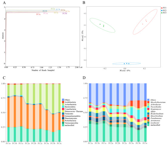 Diversity and composition of bacterial community in FC samples. (A) Shannon–Winner curve of bacterial community in FC samples. (B) Bacterial communities were based on Bray–Curtis PCoA analysis. (C) Composition of bacterial community at phylum level (TOP10). (D) Composition of bacterial community at genus level (TOP10).